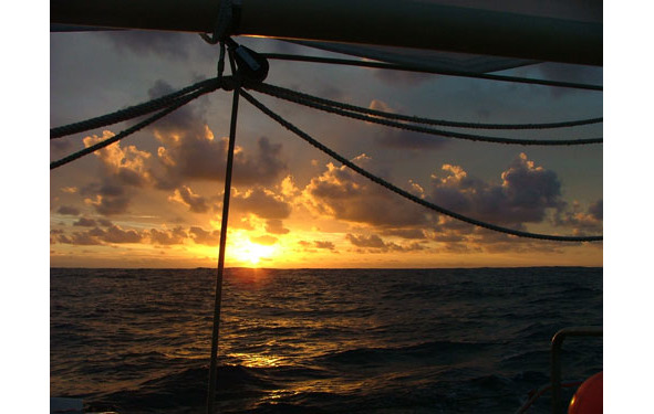 16—05. Идем под всеми парусами, включая топсель, с попутным ветром. Ветер хорош, до 10 метров, лодка бежит в среднем 5—7 узлов, волна, гики раскреплены завал-талями. Народ поукачался, и стремится сидеть на палубе, так что внутри просторно. Уже привыкли к системе вахт, надеюсь, сегодня будет вечерний фильм. Сегодня стали появляться пароходы, видимо — рыбаки, в эфире — русская речь. Вода уже 19С, воздух днем 17, ночью 10—12.
