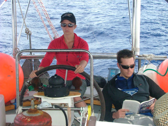 Мы бежали первые сутки слишком быстро, и почти всю последнюю ночь шли под одним фоком, чтобы проходить риф в дневное время. Ночью поймали тунца, килограммов на 8—10, еле вытащил. Этакий поросенок, Саша потом полночи жарил, до самого прихода. Перед этим другую леску оборвала какая-то большая рыба, откусила стальной тросик с последним нагасакским воблером, шлепнула напоследок хвостом, леска только звякнула, и все.
