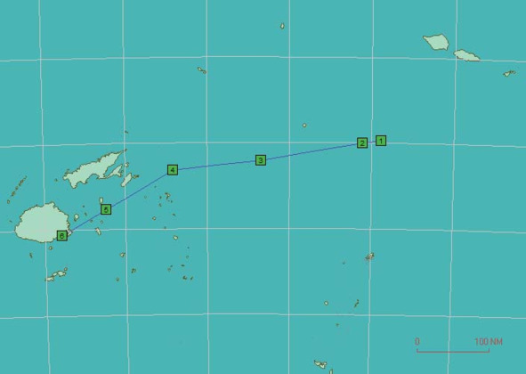 COMMENT: Passage to Fiji, Suva. Jib, fore, main/2riff. All is well