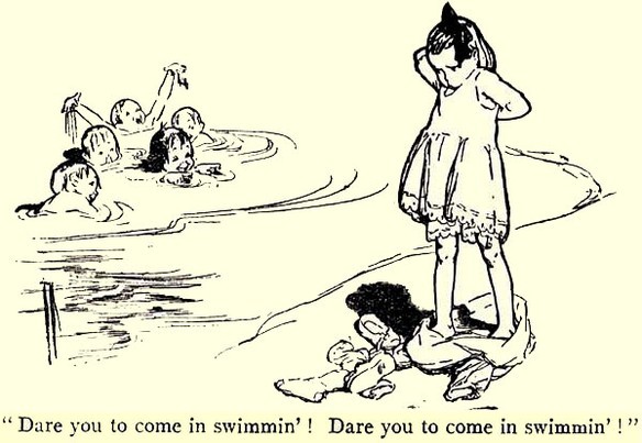 For the boys this was a turn of events unexpected and most disconcerting. Not for a moment did they really want her to accept their dare. Why, whoever heard of a girl doing such a thing? The very thought scandalized them deeply. Indeed, they would stop her if they could, but it was utterly beyond their powers of expression to tell her that the dare was a mere joke, a pleasantry that had better be forgotten. Unable to explain this, they wriggled about uncomfortably in the water and hid their growing confusion in half-hearted jeers.