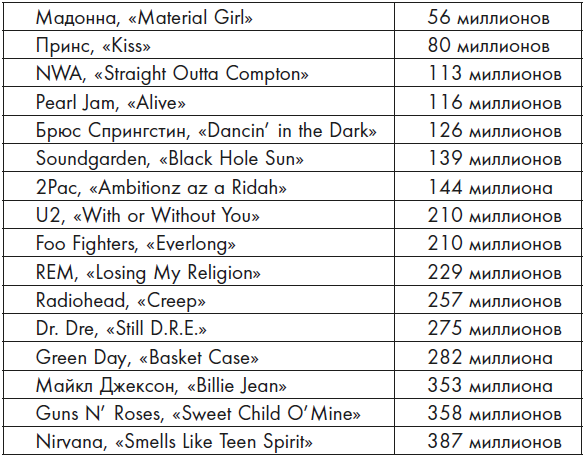 Самое близкое к количественному выражению влияния Курта, что я могу представить, – это статистика на стриминг-сервисе Spotify, который открыли в 2008 году, через четырнадцать лет после смерти Курта. Вот список самых прослушиваемых за всю историю Spotify песен, записанных исполнителями, такими же известными, как Курт, а также некоторыми другими артистами, которые стали известными примерно в одно время с Nirvana. (Цифры приведены на май 2018 года.)