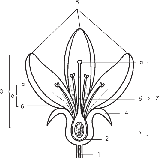 Рис. 1. Строение обоеполого цветка: 1 – цветоножка; 2 – цветоложе; 3 – околоцветник; 4 – чашелистики; 5 – лепестки; 6 – тычинка (а – пыльник; б – тычиночная нить); 7 – пестик (а – рыльце; б – столбик; в – завязь)