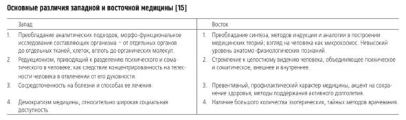 Васильев А. П. и Стрельцова Н. Н. в статье «Кризис современной медицины и возможные пути выхода из него» (2015) привели сводную таблицу различий между западной (читай — ортодоксальной) и восточной (читай — альтернативной) медицинами.