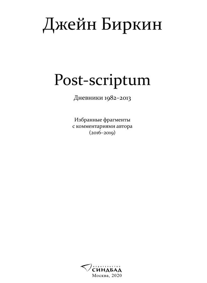 Post-scriptum / Джейн Биркин; [пер. с фр. А. Васильковой, Т. Чугуновой, Е. Леоновой]. — М. : Синдбад, 2020.