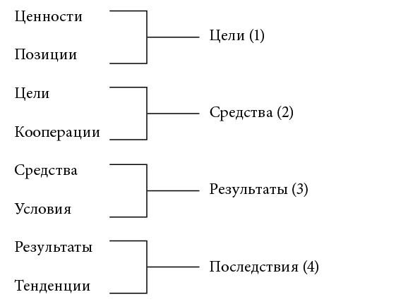 Во-вторых, функционально различную роль имеет каждый из двух элементов левого столбца схемы: первый как бы предзадан, уже очевиден либо из предшествующего опыта, либо непосредственно из предыдущих этапов разработки стратегии (с последним связан перенос правого элемента по схеме на ступень ниже в левую часть). Второй же элемент левого столбца выражает то, над чем в данный момент времени идет работа и поиск; в игровых ситуациях он всегда ситуативен (момент ситуативности сохраняется и при других формах использования схемы). Построение содержания правой части схемы – что является практической целью каждого этапа – складывается, таким образом, из связывания уже предзаданного и привносимого нового.