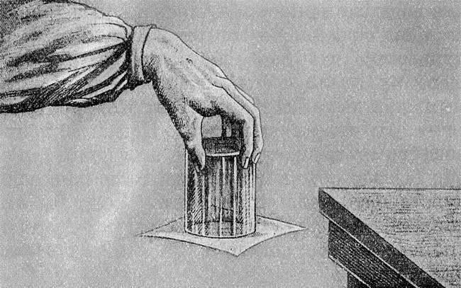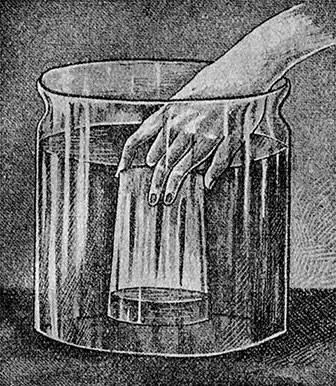 Как узнать, что воздух давит на все, что он окружает? Чтобы увериться в этом, поступим так: нальем стакан до краев водой и прикроем его кусочком картона или игральной картой. Постараемся, чтобы в стакане не осталось ни капельки воздуха. Потом, придерживая покрышку пальцем, перевернем стакан вверх дном. Теперь вы можете отнять от покрышки палец и, может быть, очень удивитесь тому, что покрышка не упадет и вода не выльется из стакана. Не правда ли, это очень странно? Подумаем, однако, почему вода не выливается из стакана.