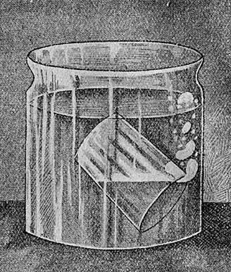 Как же увериться, что действительно воздух не позволяет покрышке отпасть от стакана? Доказать это очень просто, стоит только в стакан впустить воздух: проколоть в покрышке дырку. Тогда воздух войдет в стакан и будет давить на покрышку с обеих сторон. Тогда покрышка сейчас же отпадет. Снизу будет давить по-старому только воздух, а сверху – и воздух, и вода. Значит, давление сверху будет сильнее, чем снизу, и покрышка должна упасть.