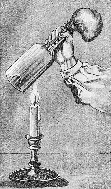 Что сжатый воздух давит, можно доказать очень просто. Налейте бутылку наполовину водой. В пробку ее вставьте трубку с узеньким кончиком такой длины, чтобы нижний конец трубки, когда закупорена бутылка, опускался в воду. Закупорить бутылку надо плотнее, и если остаются щели, то надо залить пробку сургучом или воском. Возьмите теперь конец трубки в губы и попробуйте вдувать через него, насколько хватит сил, воздух в бутылку. Вы увидите по пузырькам воздуха, что воздух войдет в бутылку. Этот воздух будет сжат, потому что он поместился в том самом месте, где уже раньше был не сжатый воздух. Если теперь перестать в трубку дуть, то из нее будет бить фонтанчик воды. Он будет бить до тех пор, пока уровень воды в бутылке немного не понизится, то есть, иначе говоря, пока воздух, находящийся над водой, не расширится.