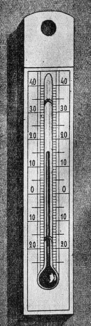 Как воздух, так и твердые тела и жидкости при нагревании расширяются, а при остывании сжимаются. Этим-то люди и воспользовались для устройства градусника. Рассмотрите как-нибудь при случае комнатный градусник. В стеклянном шарике его налита ртуть. От шарика кверху идет тонкая стеклянная трубка. Когда в воздухе делается теплее, ртуть нагревается и поэтому расширяется. Расширяясь, она поднимается по трубке кверху. С боку трубки на доске градусника написаны цифры. Если градусник опустить в воду со льдом, ртуть остановится на цифре 0; если его опустить в кипящую воду, ртуть поднимется по трубке до цифры 100. Значит, лед тает при 0 °C, а вода кипит при 100.