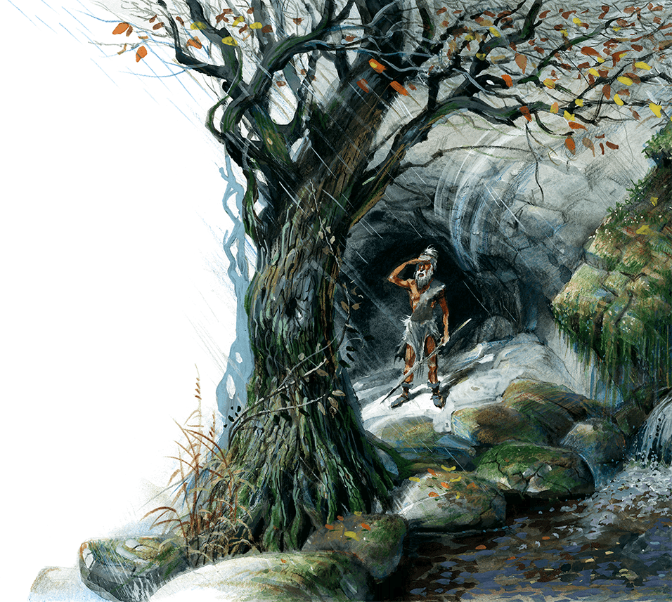 Старик ушёл в пещеру, откуда внезапно раздались странные гортанные возгласы, похожие скорее на крики встревоженных молодых животных, чем на человеческие голоса.