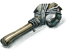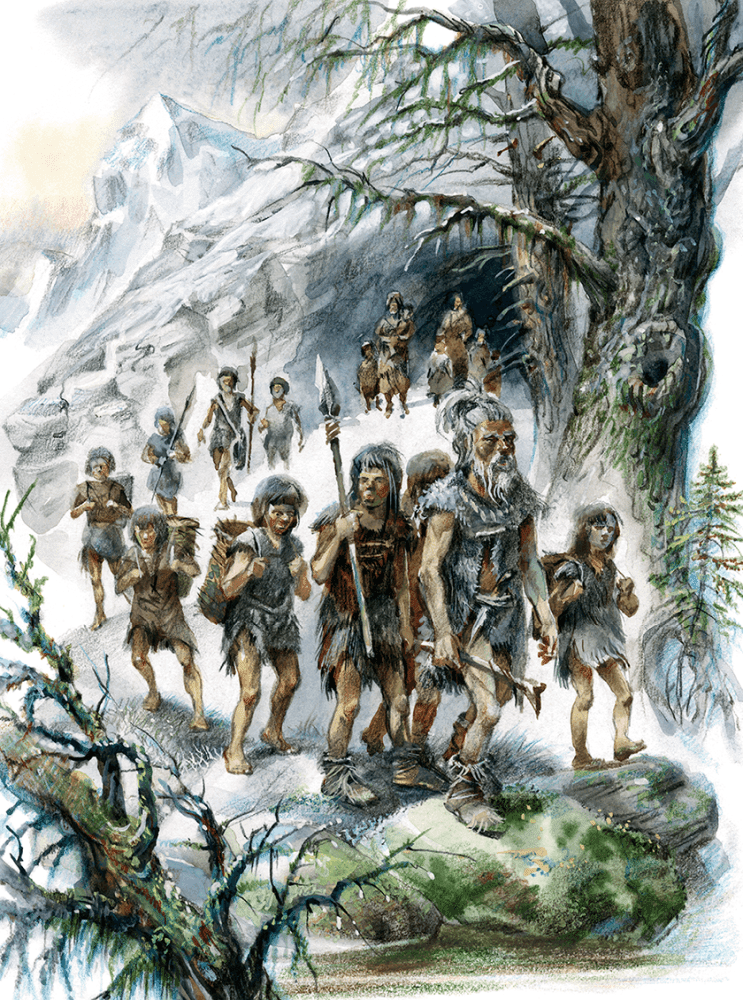 Все маленькие спутники старика несли на спине корзины, грубо сплетённые из узких полосок древесной коры; одни держали в руках короткую палицу с тяжёлой головкой, другие – копьё с каменным наконечником, а третьи – что-то вроде каменного молота.