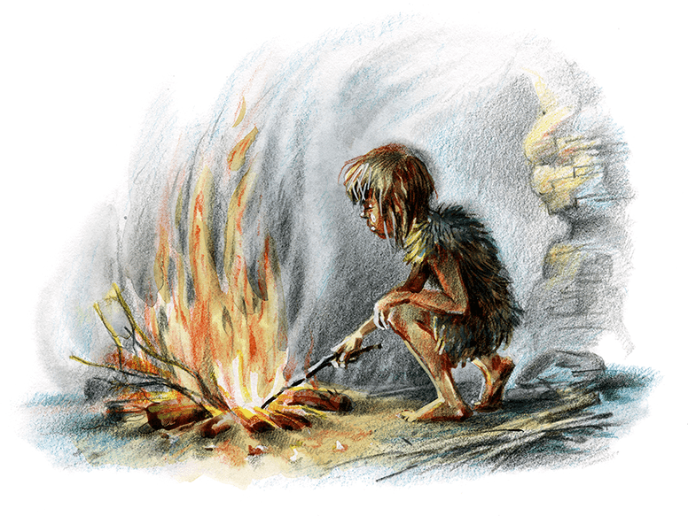 Ожо гордился этим. Он знал, что огонь – самая большая драгоценность в пещере; если огонь погаснет, его ждёт страшное наказание. Поэтому, едва мальчуган замечал, что пламя уменьшается и грозит потухнуть, он начинал быстро подбрасывать в костёр ветки смолистого дерева, чтобы вновь оживить огонь. И если порой глаза Ожо заволакивались слезами, то единственным виновником этих слёз был едкий дым костра. Скоро он и думать перестал о том, что делают теперь его братья. Другие заботы удручали маленького Ожо: он был голоден, а ведь ему едва минуло шесть лет…