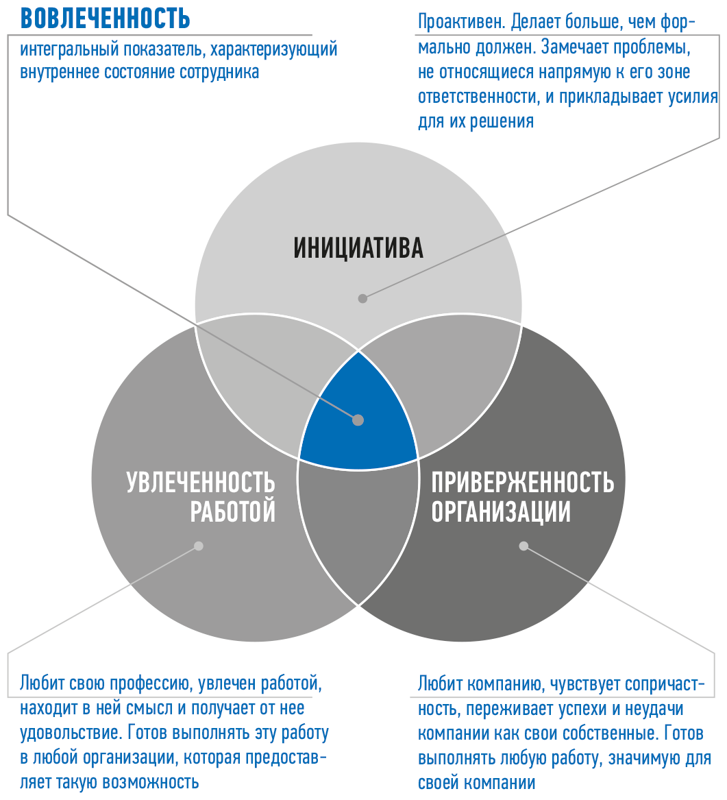 Но компании нужны сотрудники, которые будут «увлеченными для нее», то есть приверженными именно ей, а не только отрасли или профессии. Такой сотрудник любит свою работу полностью: «мне нравится моя работа и возможность реализовывать ее именно в этом месте». Поэтому приверженность компании — не менее важный компонент вовлеченности персонала.
