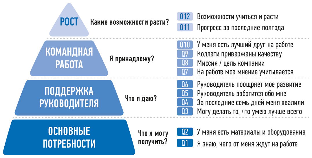 Институт Гэллапа на основе собственных исследований создал модель «Q12» — 12 вопросов персоналу, ответы на которые коррелируют с производительностью труда, лояльностью клиентов и ростом продаж. Среди них есть такие, как «Знаю ли я, что от меня ожидается на работе?», «Есть ли у меня на работе человек, который поощряет мой рост?», «Работает ли в моей компании один из моих лучших друзей?» и т.п.