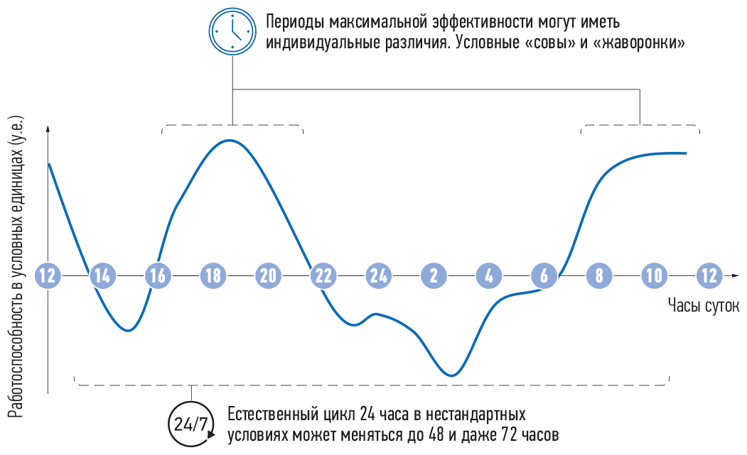 Учитывать влияние циркадного ритма на энергичность работника становится необходимостью в самых разных областях. Пилоты, стюардессы и космонавты [18] перемещаются между часовыми поясами. Сотрудники круглосуточного производственного цикла регулярно меняют периоды активности и отдыха в зависимости от смены. Все это расходует силы организма, сказывается на энергичности и, как следствие, — на увлеченности работой.