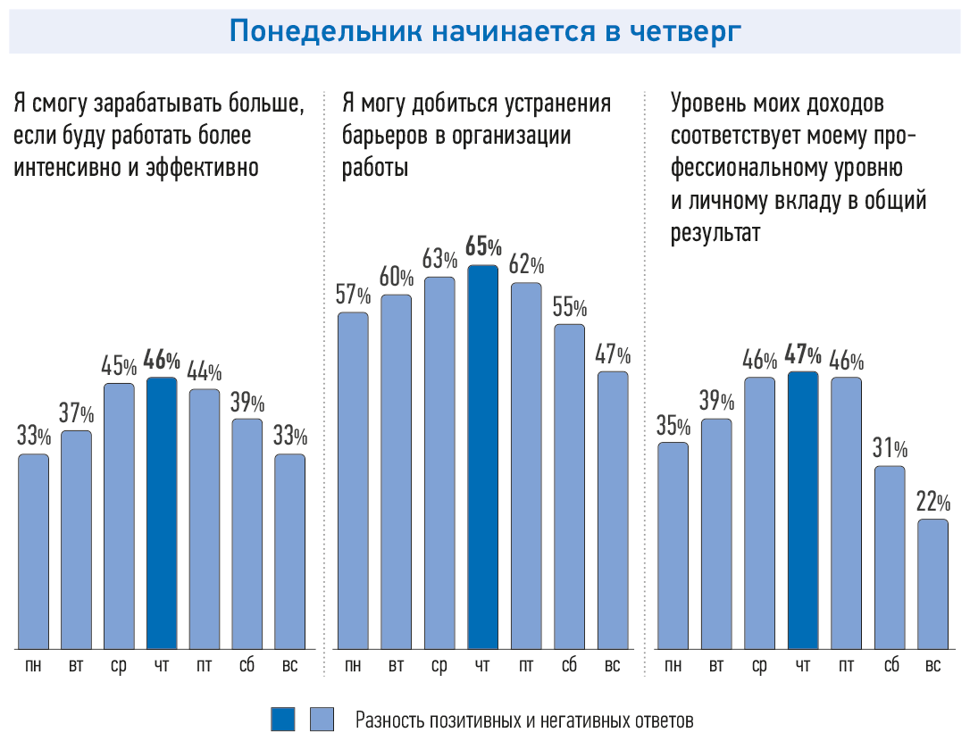 В данном случае, конечно, нужно учитывать отношение респондентов к самому анкетированию. Возможно, работник в выходные шел за покупками, осознавал, сколько у него денег, — и критичнее отвечал на эти вопросы. Или, заполняя опросник в свой выходной, то есть работая в личное время, думал: «Я такой ответственный, так хорошо работаю, а мне, наверное, платят меньше, чем должны». Но это тоже в каком-то смысле относится к недельным цикличным процессам.