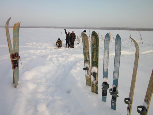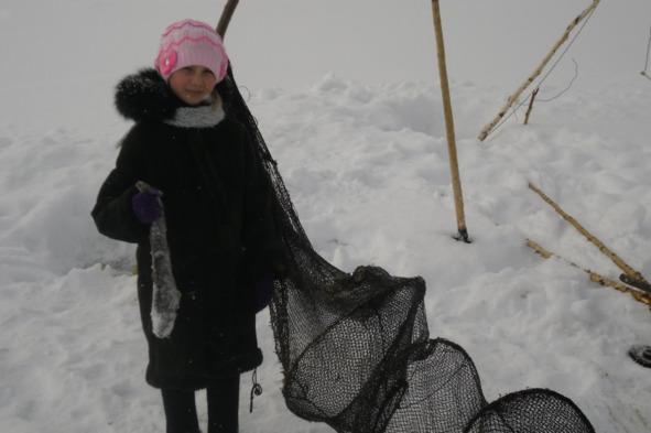 Взрослые развели небольшой костёр прямо на снегу и занимались проверкой снастей, из которых доставали живую рыбу. На снегу маленькие рыбки извивались и прыгали, а большие налимы лежали спокойно, как и подобает солидным рыбинам. Они, наверно, мысленно говорили следующее: «Чего теперь прыгать, коли попались!»
