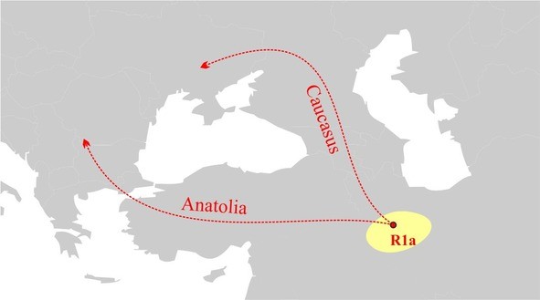 R1a-YP1051Анализ распределения носителей субкладов R1a-YP1272 и R1a-YP1051 на территории Европы дает основания предположить, что миграция носителей y-гаплогруппы R1a на территорию Европы проходила двумя основными маршрутами: первый маршрут — через территорию Анатолии на Балканский полуостров, а второй — через Кавказские горы между Черным и Каспийским морями (рис.6).