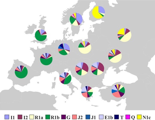 В некоторых случаях попытки ассоциировать распространение языков, принадлежащих к какой-либо языковой семье, с миграцией носителей определенной y-гаплогруппы или даже субклада являются вполне оправданными. Например, подавляющее большинство коренных жителей Северной и Южной Америки являются носителями субклада Q1a3, что дает основание считать, что распространение языков индейцев Северной и Южной Америки связано с носителями именно этого субклада. Схожая ситуация наблюдается с сино-тибетскими языками: у популяций, говорящих на сино-тибетских языках, чаще всего встречается y-гаплогруппа O. С народами, живущими на территории Европы, все гораздо сложнее. Современные популяции европейцев являются результатом смешения носителей различных y-гаплогрупп (рис.3).