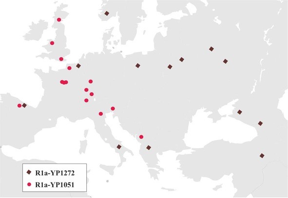 RДля определения основных маршрутов миграций носителей y-гаплогруппы R1a с территории Иранского нагорья в Европу необходимо проанализировать распределение основных субкладов данной y-гаплогруппы. Таких субкладов всего три: R1a-YP1272 — возник примерно 14300 лет назад, R1a-YP1051- возник примерно 8500 лет назад и R1a-M417 — возник примерно 8500 лет назад. Несмотря на то, что носителей субкладов R1a-YP1272 и R1a-YP1051 [2] (рис.5) найдено не так уж и много, тем не менее картина распределения выявленных при тестировании носителей данных субкладов дает возможность определить маршруты миграций всех трех основных субкладов y-гаплогруппы R1a.