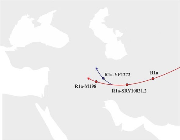 Таким же образом можно восстановить маршруты миграции наших более отдаленных предков. Например, предки большей части мужского населения сегодняшней Европы (носители y-гаплогрупп R1a и R1b) пришли на территорию Европы из Азии. Y-гаплогруппа R возникла где-то на территории Сибири примерно 30 тысяч лет назад. Исследования человеческих останков, найденных на позднепалеолитической стоянке в Сибири у нынешнего села Мальта Усольского района Иркутской области [4], показали, что останки принадлежали носителю y-гаплогруппы R. Y-гаплогруппа R1, вероятно, возникла так же на территории Сибири примерно 27 500 лет назад. С началом ледникового периода одна из групп носителей y-гаплогруппы R1 мигрировал из Сибири в Среднюю Азию, где примерно 22 000 лет назад произошло разделение на y-гаплогруппы R1a и R1b. Далее носители y-гаплогрупп R1a и R1b продолжили миграцию в юго-западном направлении на территорию Иранского нагорья (рис.4).