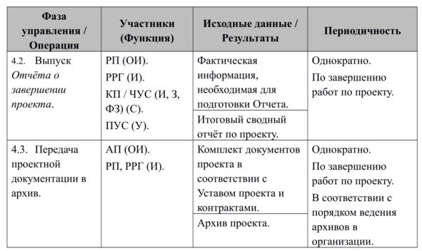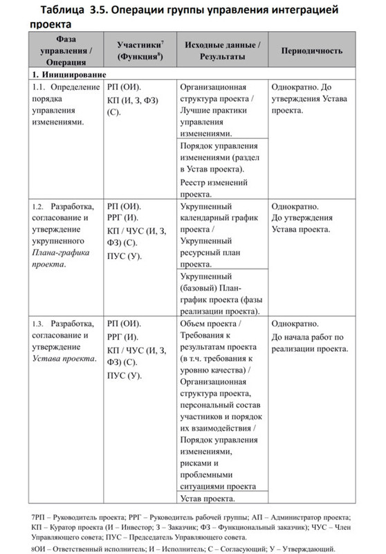 Описание основных операций группы управления интеграцией проекта (сгруппированные по фазам управления) приводится в Табл. 3.5.