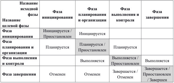 Фазы управления проектом реализуются последовательно и итерационно повторяются при переходе от одной фазы реализации проекта к другой. Прохождение всех фаз управления проектом на одной фазе реализации проекта образует цикл управления фазой реализации проекта. В зависимости от текущей фазы управления проектом выполняется определенный набор операций управления по каждой предметной области управления. В случае возникновения изменений ключевых показателей проекта возможен возврат на одну из предыдущих фаз управления проектом. При изменении фазы управления проектом изменяется состояние проекта(характеристика степени завершенности проекта). Возможные варианты изменения состояний проекта представлены в Табл. 1.1.