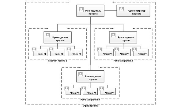 Для повышения эффективности управления проектом организуется офис проекта (проектный офис), имеющий, как правило, отдельное помещение и обеспеченный всеми необходимыми ресурсами и программно-техническими средствами. В проектном офисе размещаются рабочие группы проекта, Руководитель проекта (осуществляет общее руководство офисом) и Администратор проекта (отвечает за всестороннее обеспечение офиса). Офис проекта может быть организован на территории Заказчика, на территории Исполнителя, а также одновременно и у Заказчика, и у Исполнителя.