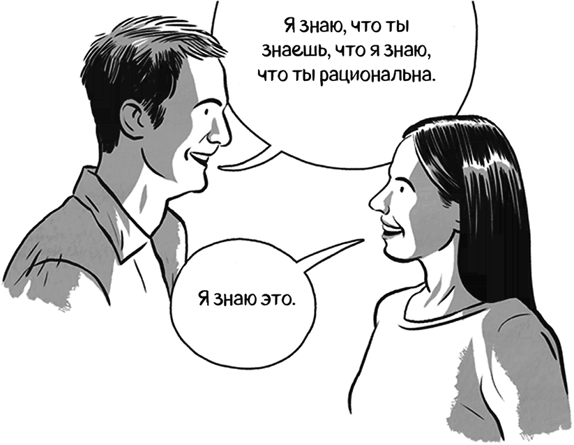 Общеизвестность рациональности игроков – это менее определенный критерий, значение которого в следующем: «Не только мы оба должны быть рациональны, но и я должен знать, что ты рационален. Мне нужен и второй уровень знания: я должен знать, что ты знаешь, что я рационален. Так же необходимый мне третий уровень знания гласит: я должен знать, что ты знаешь, что я знаю, что ты знаешь, что я рационален». И так далее к более глубоким уровням знания. Общеизвестность рациональности требует от игроков способности бесконечно продолжать эту цепь знаний.