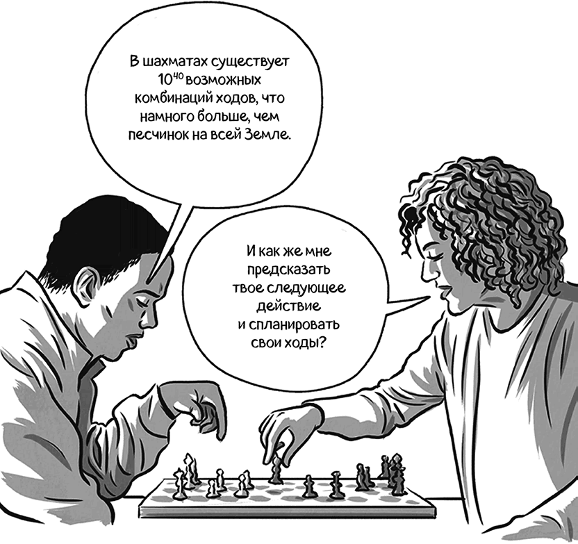 Шахматы – прекрасный пример того, как множество вариантов усложняет игру, предсказывание последующих шагов и исхода. В шахматах есть определенные правила. Существует ограниченное количество вариантов ходов в каждой позиции. Тем не менее сложность этой игры поражает, хоть она и намного проще любого акта человеческого взаимодействия.