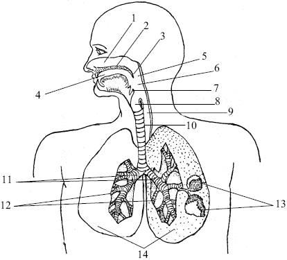 Рис. 1. Схематическое изображение органов дыхания. 1 – полость носа; 2 – твердое небо; 3 – мягкое небо (язычок); 4 – полость рта; 5 – носоглотка; 6 – ротовая часть глотки; 7 – надгортанник; 8 – полость гортани; 9 – пищевод; 10 – трахея; 11 – главные левый и правый бронхи; 12 – разветвления бронхов (бронхиолы); 13 – легочные пузырьки (альвеолы); 14 – левое и правое легкое