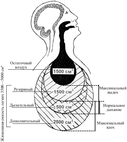 В покое взрослый человек делает примерно 16 дыханий в одну минуту. За каждый вдох в легкие попадает около 50 мл воздуха. При самом глубоком вдохе можно дополнительно вдохнуть около 1500 мл воздуха, а при самом глубоком выдохе выдохнуть еще 1500 мл резервного воздуха, однако и после этого в дыхательной системе останется еще около 1500 мл воздуха.
