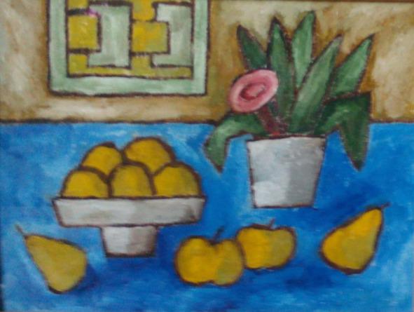 — Этот натюрморт был написан в один прием (а-ля-прима),выполнен в духе «Бубнового валета», гармоничный и выполнен в голубых и бежевых тонах, рада, что вам понравился. Техника живописи «A la prima"как японская каллиграфия несет отпечаток руки, эмоций автора. Здесь необходима полная свобода и открытость всему.