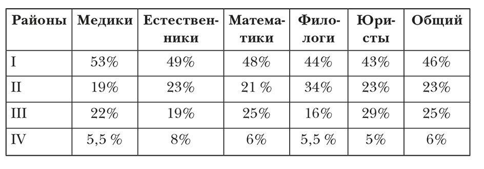 Москва разделена на 4 района. Первый от университета – между Никитскими и Тверской улицами и дальше между Пресней и Тверской-Ямской до окраин города – сюда входят старый студенческий лагерь (Бронные) и нарождающийся (Грузины и Пресня). Второй район простирается от Москвы-реки до Никитских и Пресни (медики старших 3-х курсов, живущие около клиник, не вошли в это число). Третий район – остальная часть Москвы, кроме Замоскворечья. Четвёртый – Замоскворечье. Процентное отношение живущих по этим районам ко всему числу студентов по факультетам выразится в таких цифрах:
