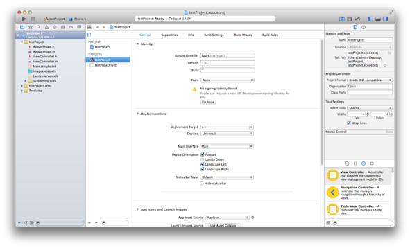 Далее вводим данные, название проекта, название компании, уникальный идентификатор компании, язык на котором мы будем программировать, выбираем Objective-C, далее выбираем для какого типа устройств создаем приложением, и последний пункт — Core data, это некая оболочка/Фреймворк для обработки данных. Пока что, вы можете вводить любые данные, т.к. этот всего лишь тестовый проект.