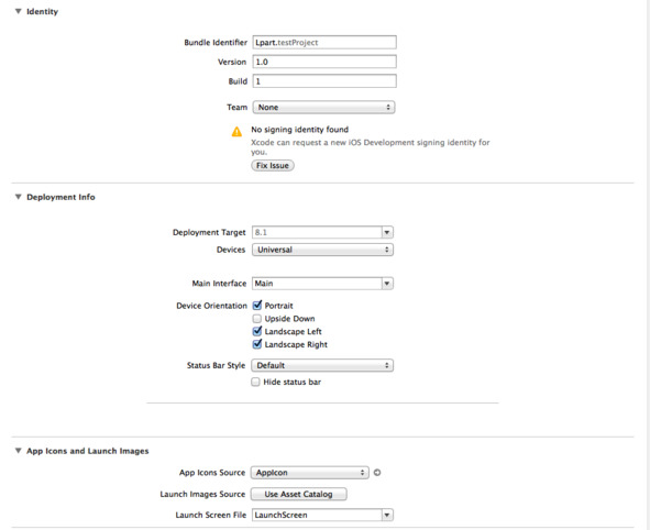 Далее идут основные параметры проекта (рис. 1.3). Identity. В нем предоставляется информация о проекте и команде разработчиков. Deployment info — здесь мы указываем, какие версии iOS будет поддерживать наше приложение, для какого устройства разработка ведется, какие допустимы ориентации устройства. Status Bar — это строка состояние устройства.