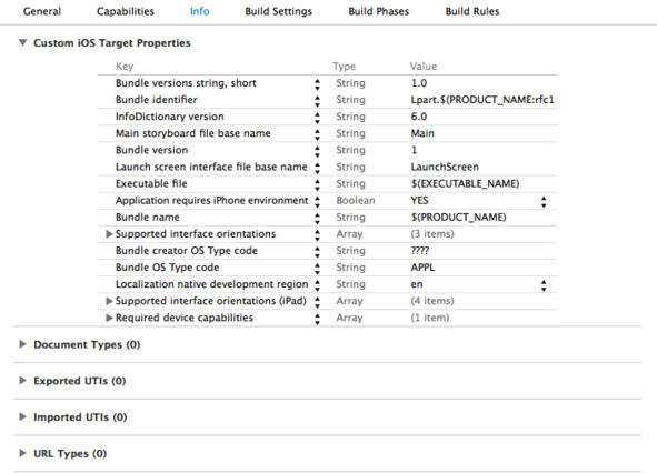 Вернемся к настройкам проекта, рассмотрим еще параметр info (рис. 1.6). В нем содержаться основные данные о проекте, которые хранятся в файле "Info.plist», в нем мы можем указывать параметры нашего проекта. Вкладка Capabilities, содержит возможности приложения, такие как: Game Center, iCloud, Maps и т. д. В этой кладке мы подключаем дополнительные возможности. Далее Build Settings — настройка сборки приложения. Build Phases — позволяет нам настраивать сборку приложения для текущего target. Build Rules — позволяют нам задавать правила сборки приложения, к примеру, в момент сборки, сжимать текстовые файлы с помощью определенных скриптов.