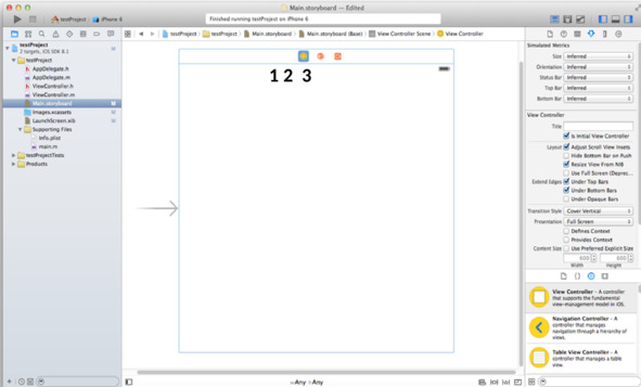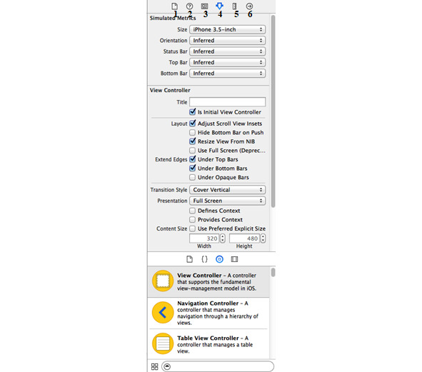 Разберем пронумерованные вкладки (рис 1.9). Первая — файловый инспектор, в котором указаны характеристики storyboard, такие как: где расположен файл, под какую версию разрабатывается и т. д. Вторая — быстрый помощник. Третья — идентификатор выбранного объекта, в нем задается идентификатор объекту, указывается класс. Четвертая вкладка — параметры объекта. В пятой вкладке, настраиваются размеры объекта. Шестая — показывается существующие связи между объектами.