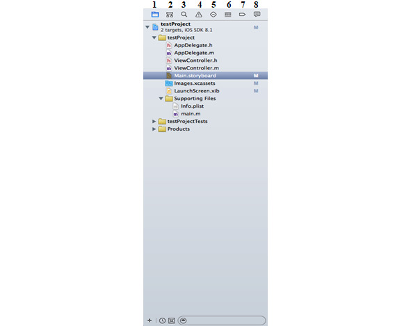 Рассмотри навигацию проекта (рис. 1.10). Первая вкладка — файловый инспектор проекта. Вторая — показывает нам классы, а при их раскрытие, показывает методы классов. Третья — поисковая строка, ищет во всем проекте, также можно искать и в самом классе (cmd+f). Четвертая — показывает список предупреждений и ошибок, если таковые имеются. Пятая — список существующих тестов для приложения. Шестая вкладка — показывает нагрузку на процессор, память, сеть, файловую систему телефона. Седьмая — список точек остановок. Восьмая — показывается выполненные действия над проектом.