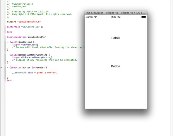 Теперь закроем второе окно и перейдем в класс ViewController. m. Найдем в нем метод — (IBAction) button: (id) sender. Это метод кнопки, который вызывается каждый раз, когда мы нажимаем на кнопку. Пропишем в этом методе следующий код: