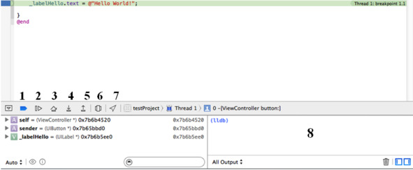Первая кнопка — отключает/включает точки остановки. Вторая — продолжить/приостановить процесс работы приложения. Третья — пошаговая отладка кода. Четвертая кнопка — заход в метод. Пятая — выход из метода. Шестая — позволяет нам просматривать наше приложение в виде 3D-модели. Седьмая кнопка — задает местонахождение. Окно под номером 8 — консоль, в которой выводятся системные сообщения.