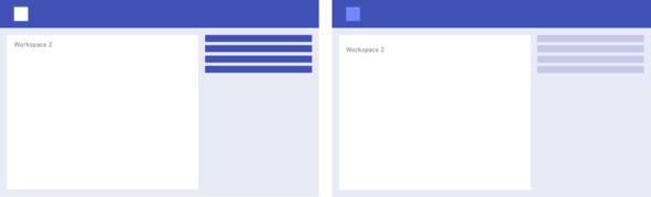 Пользователь стремится игнорировать элементы, находящиеся в другой рабочей области, во время работы с текущей — подсознательно он представляет, что где-то там находится ряд функций, которые ему могут понадобится, но сознательно он их «не видит». Отсюда можно сделать вывод, что элементы внутри областей должны находиться на одном уровне интенсивности относительно других областей. Например на рисунке 2.2 очевидно, что в первом варианте сбивается изначально заданный баланс: элементы списка справа конфликтуют с горизонтальной шапкой. Во втором варианте он сохранен: внимание в первую очередь направленно на заголовок Workspace1.