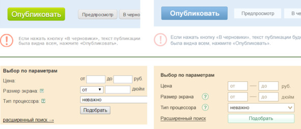 Следует использовать только сознательно подобранные цвета. Это основная ошибка очень большого количества дизайнеров. Часто можно видеть пример, когда дизайнер берет элемент, основываясь на абстрактных представлениях о том, что «подтвердить» должно быть зеленым, а «отменить» — красным. Помимо явной ограниченности такого подхода есть еще и проблема того, что не все понимают, что, если ты использовал определенный зеленый цвет, ты можешь к нему использовать только строго определенный красный. Случайных цветов не бывает вообще: человеческий глаз способен улавливать малейшие отличия и подсознательно всегда воспринимает цветовой диссонанс. Более того, следует помнить, что большинство современных экранов имеют весьма ограниченные цветовые пространства, и диссонансы на них представляются гораздо более грубыми, нежели, скажем, на холсте. Пара примеров подобного отношения (рисунок 2.3.):