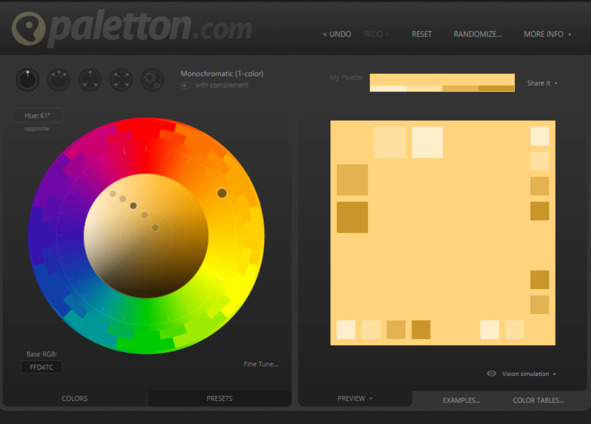 Кстати, веб-цвета тоже настоятельно не рекомендуется использовать, особенно учитывая современное развитие браузеров. Веб-цвета — это всего лишь оптимизация значений, они на удивление грубы и плохо соотносятся между собой. Во время разработки палитры интерфейса стоит использовать различные генераторы палитр и цветовых схем. Например это Kuler от компании Adobe или Paletton (Рисунок 2.5.). Разумеется, все вышеперечисленное следует воспринимать с умом, а не в лоб. Для того, чтобы грамотно подобрать практически любой цвет, как правило, приходится подвигать ползунок тона, т.к. чистые относительные цвета обычно недостаточно/чрезмерно контрастны для своих задач.