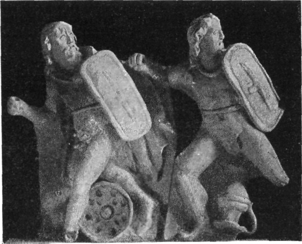 Кельтские воины. Рельефный фриз из Чивито-Альба. III в. до н. э. Терракота. Кресты на щитах кельтов! Однако это не христианство! Всемирная история, т. II, с. 136