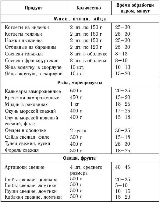 Ориентировочное время обработки продуктов паром приведено в таблице 1. Первоначально вам следует опираться на эти данные, однако затем, по мере накопления собственного опыта и с учетом своего вкуса, вы сможете устанавливать время приготовления того или иного блюда самостоятельно. Но это потом. Но сначала, когда вы только начинаете осваивать пароварку, удобнее следить за степенью готовности продукта, опираться на эти данные (не ошпарьтесь, пользуйтесь кухонными рукавицами!).