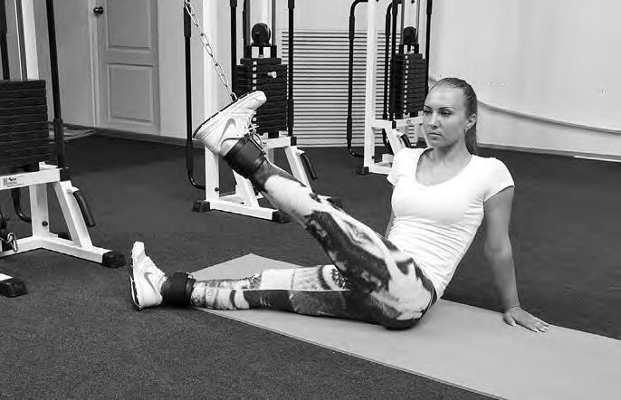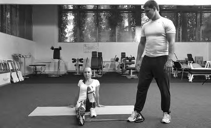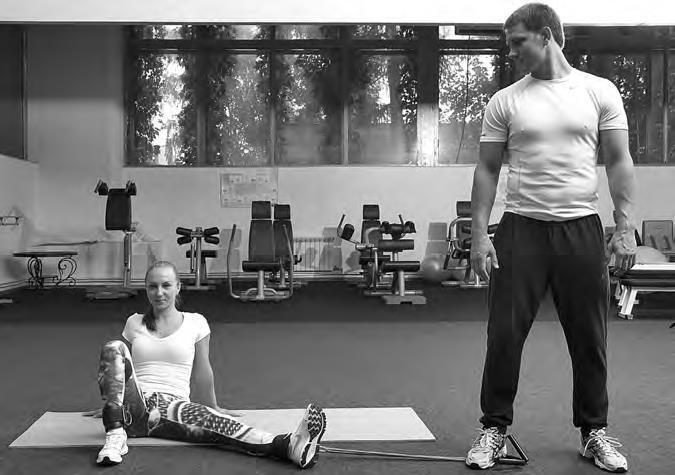 И.П. Сидя на полу, боком к неподвижной опоре (или партнеру), ноги вытянуть вперед. Тяга прямой ногой резинового амортизатора из стороны к центру.