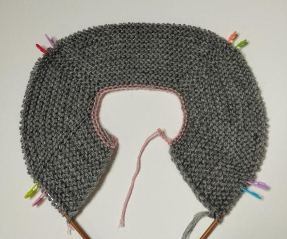 23 ряд: кромочная, 7 лицевых левой планки, переснимаем на контрастную нить 28 петель левого рукава (26 петель левого рукава +2 петли реглана по одной с каждой стороны рукава = 28), вяжем 39 лицевых спинки (37 петель спинки +2 петли реглана), переснимаем на контрастную нить 28 петель левого рукава (26 петель левого рукава +2 петли реглана по одной с каждой стороны рукава = 28), 7 лицевых петель правой планки, 1 изнаночная (всего 55 петель на круговых спицах 8+39+8=55).