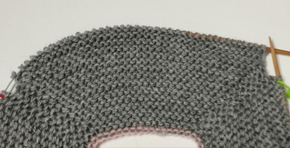 Пропускаем 8 петель левой планки (7 петель левой планки +1 петля реглана = 8) и 28 петель левого рукава (26 петель левого рукава +2 петли реглана по одной с каждой стороны рукава = 28), берем нить от другого мотка пряжи.