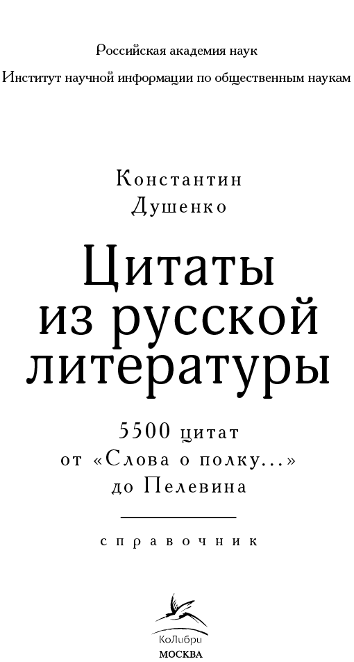 Цитаты из русской литературы : Справочник. 5500 цитат от «Слова о полку…» до Пелевина / К. Душенко. — М. : КоЛибри, Азбука-Аттикус, 2019.